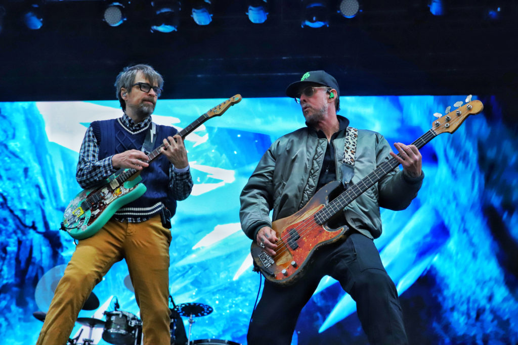 Den går sakte tilbake igjen og fortsetter inn i støyete fuzz. “Beverly Hills” er flerstemt. De får hjelp av publikum også. Gitaristen spiller et rart instrument som minner om kazoo, men ser ut som en slange. Weezer er et band med sommerlig og lett musikk som skaper god stemning.
