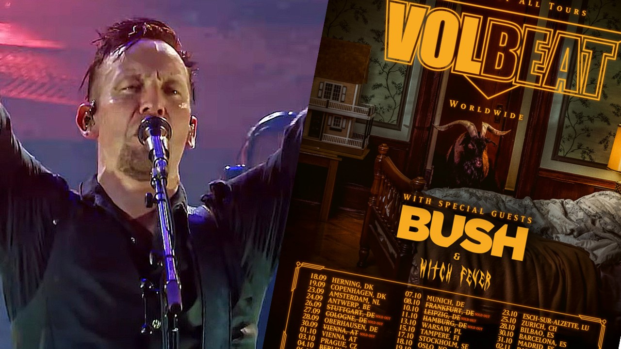 Foto: Skjermdump av video "Volbeat - For Evigt (Live from Telia Parken 2017) ft. Johan Olsen" på YouTube + offisiell turnèplakat 2025