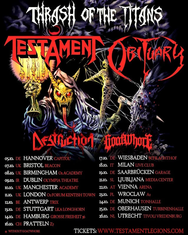 Thrash- og dødsmetalfans, gjør dere klare! I dag kom nyheten som at de legendariske amerikanske bandene Testament og Obituary slår seg sammen med de tyske thrash-ikonene Destruction og de svarte dødsmetall-krigerne i Goatwhore for en heftig Europaturné høsten 2025: